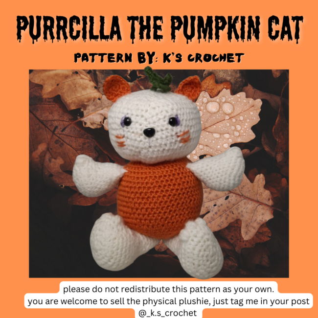 Purrcilla the Pumpkin Cat is an Intermediate Crochet pattern designed by K's Crochet for making an Amigurumi. hi everyone! thank you for using my very first pattern! I appreciate it very much! colors are infinite! just be sure to read the material list for the guide!I would love to see your finished products over on Instagram! tag me in your photos @_k.s_...