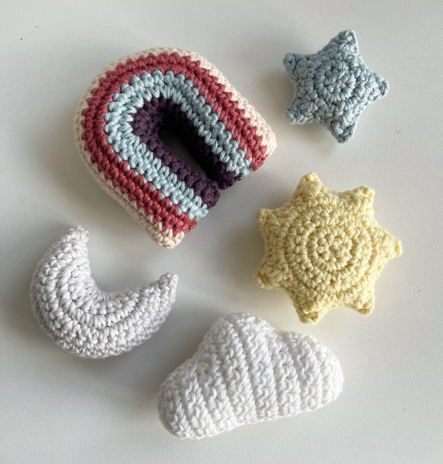 Dk weight yarn in pink, beige, white, blue, purple, grey and yellow