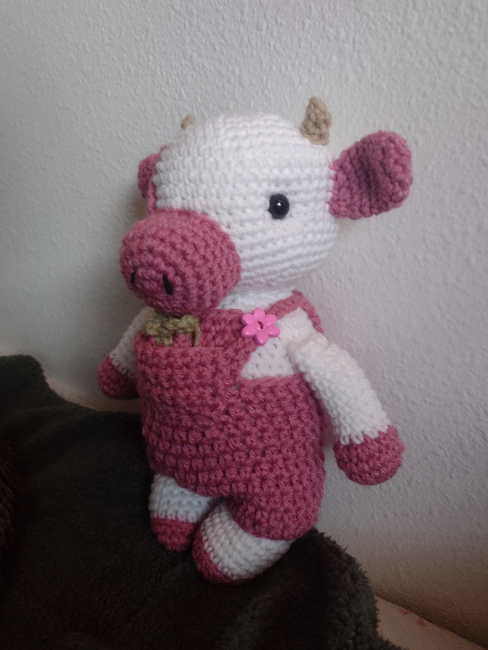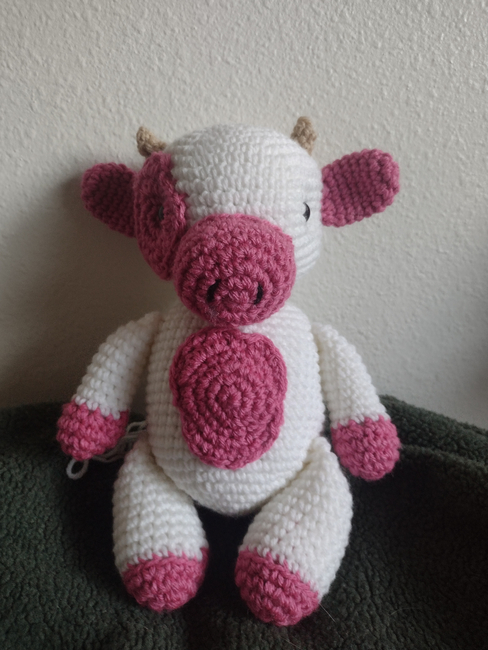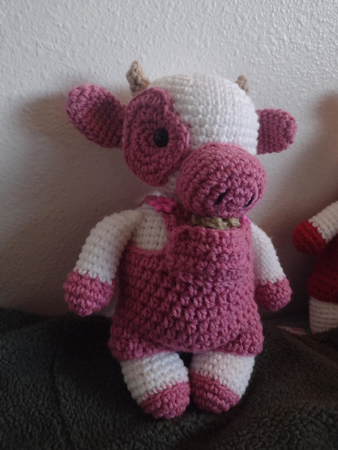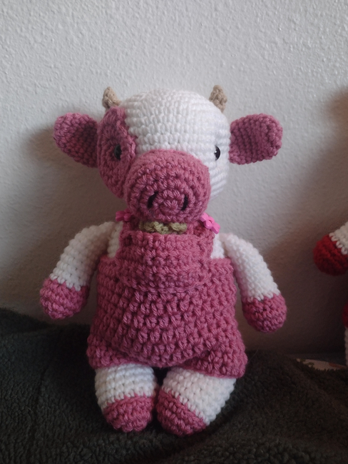 This is one of my series of my cow patterns. The cow is made in white with color corresponding spots to the theme (in this case pink). The pattern also comes with a pattern for overalls and a mini fruit (raspberry) to go with the cow.