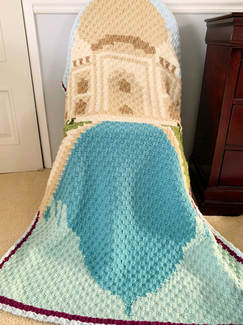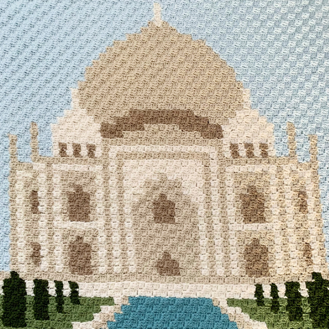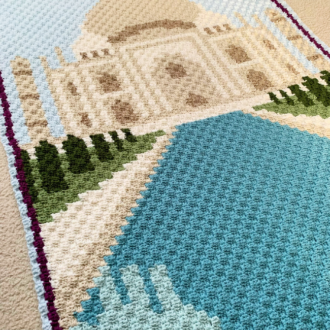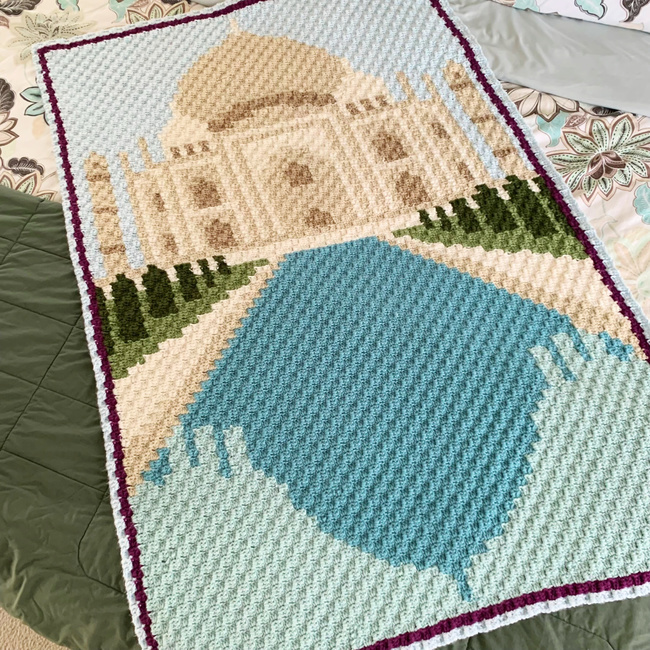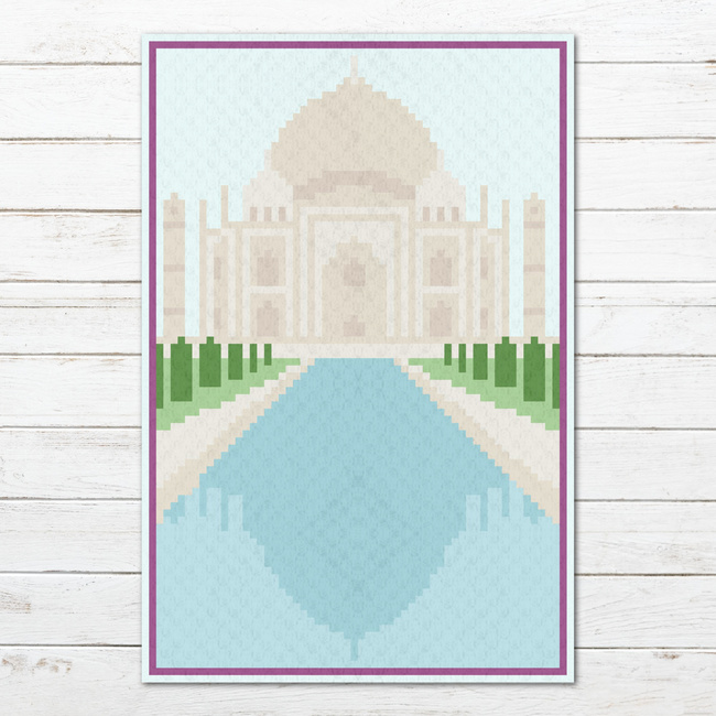 With the Reflecting on the Taj Mahal c2c crochet pattern, you can enjoy the sweeping majesty of the Taj Mahal standing proudly over a reflecting pond and garden in a blanket or tapestry. Travel via your crochet hooks and make this stunning graphgan for yourself or as a gift for a wanderlust-at-heart, travel-loving friend or family member.