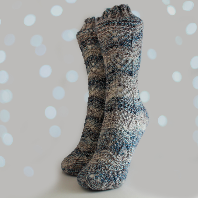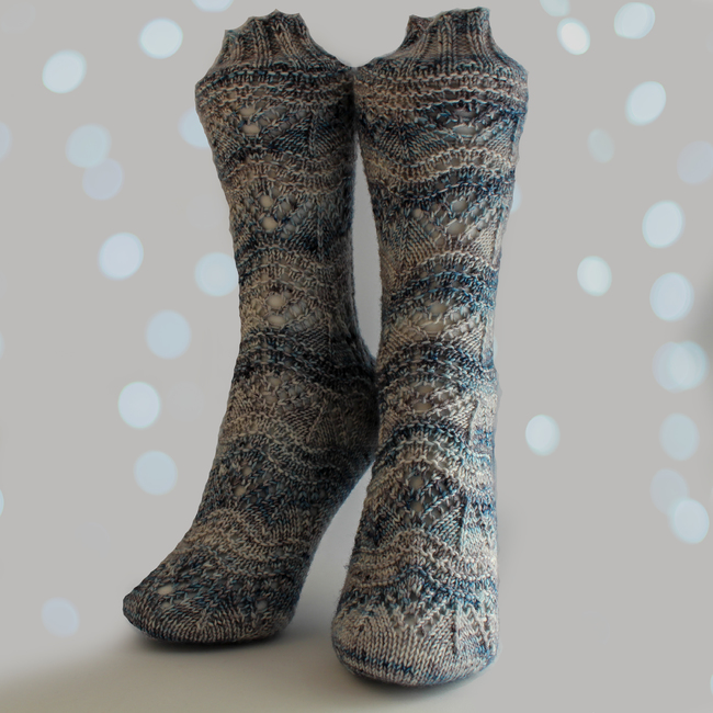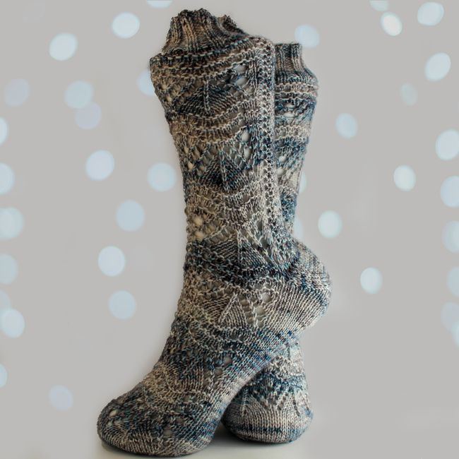 Worked in the round, Ren contains both cuff-down and toe-up written directions and a chart for the pattern stitch. The pattern has instructions for an afterthought heel, but you may substitute whatever heel you enjoy using.