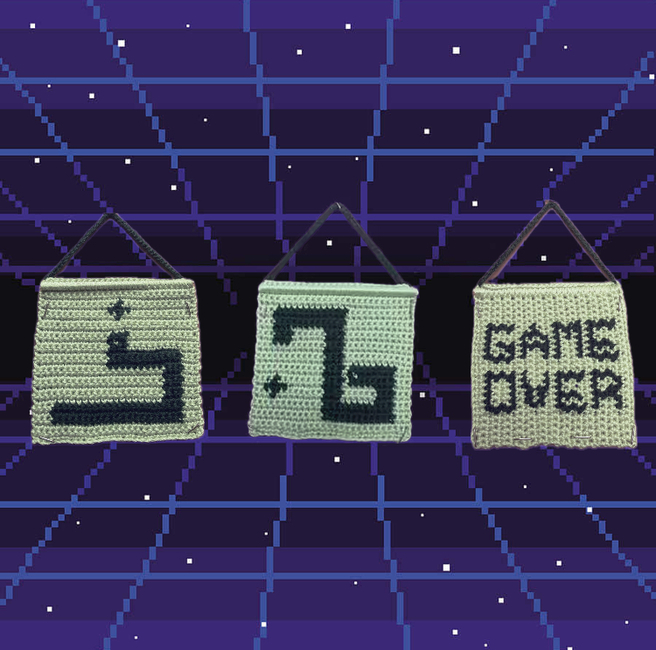 Retro snake game wall hanging trio. Make one or make them all! The pattern includes a graph and written instructions.