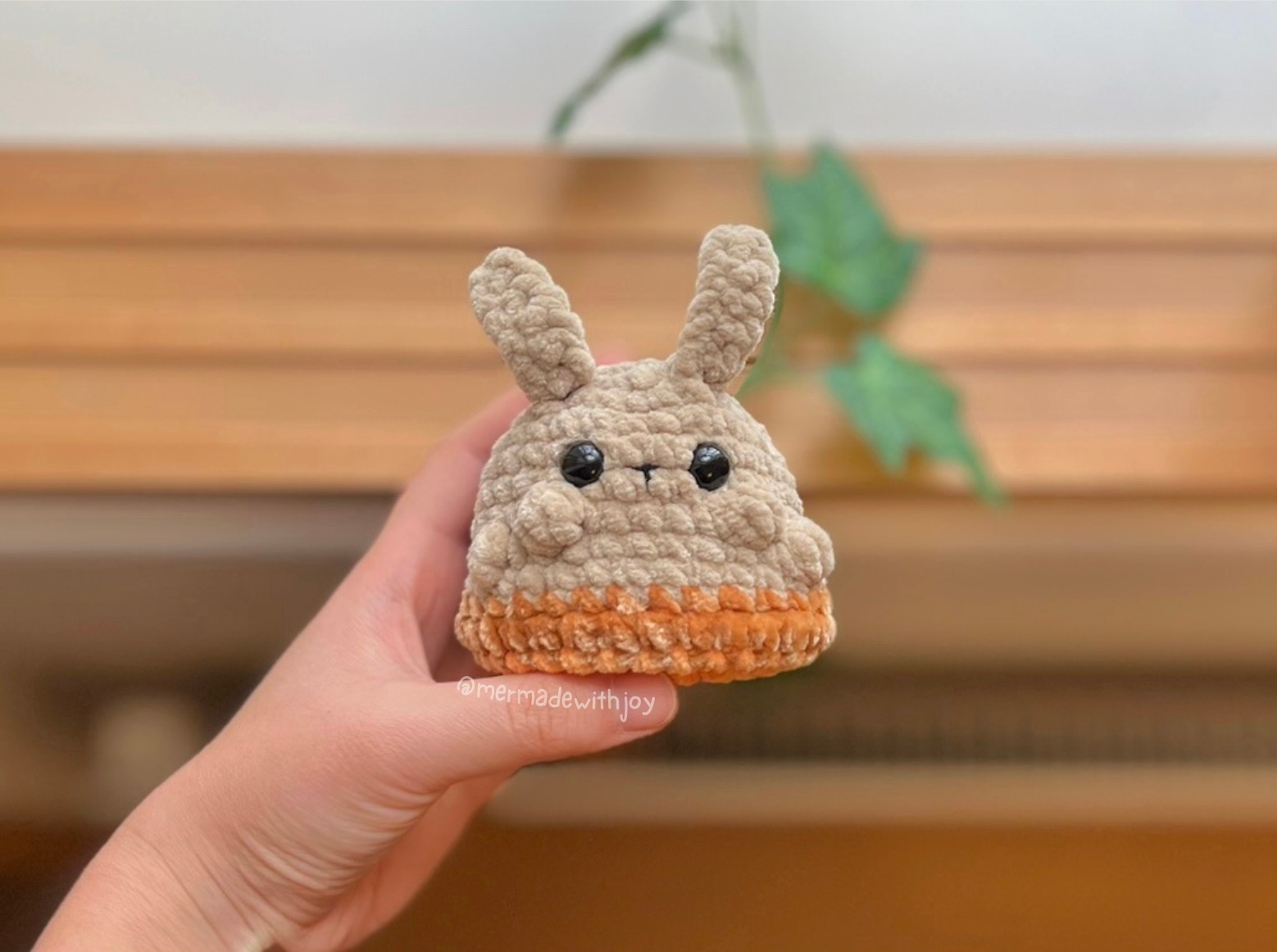 This is a no-sew reversible crochet pattern for making a sitting bunny that turns into a carrot in the soil.
