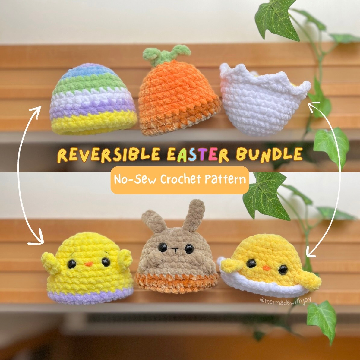 This is a no-sew pattern bundle for making reversible easter animals! It includes a pattern for two chicks (regular and easter egg) and a bunny (carrot).