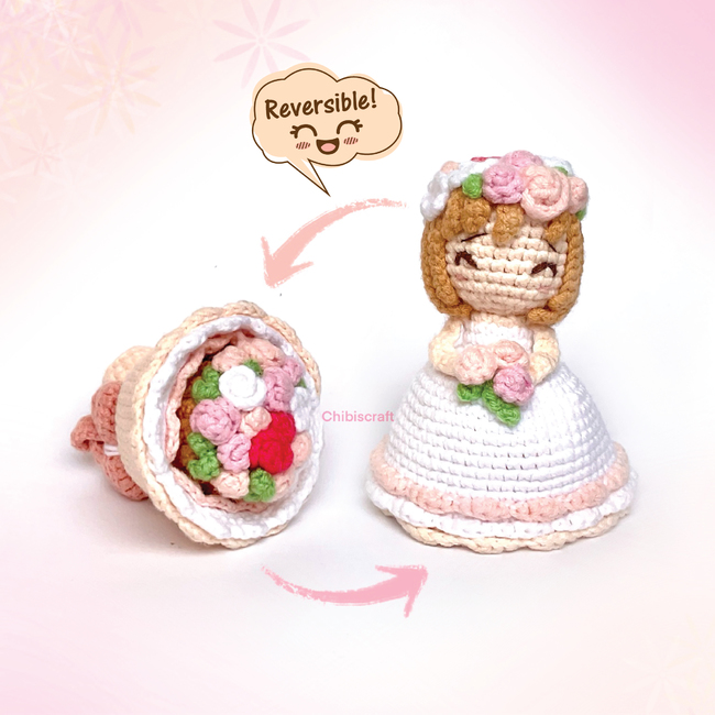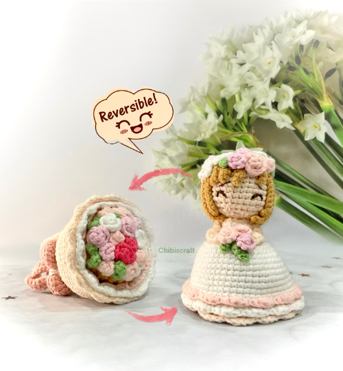 A flower bouquet and a bride in one plushie? Yes, it is a reversible amigurumi. Meet the Reversible Flower Bouquet and Bride Amigurumi, which will be a unique, original toy for you or a special gift for your loved one. Its perfect as a decoration or gift for wedding or wedding anniversary, Mothers day, or Valentines day.