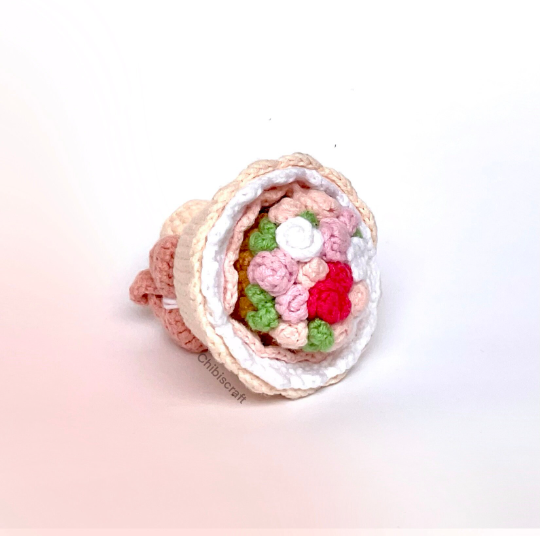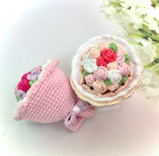 Approximate size: the finished amigurumi is about 10.5 cm (4.1") tall for the bride side and 7 cm (2.76") tall for the flower bouquet side.