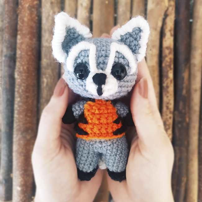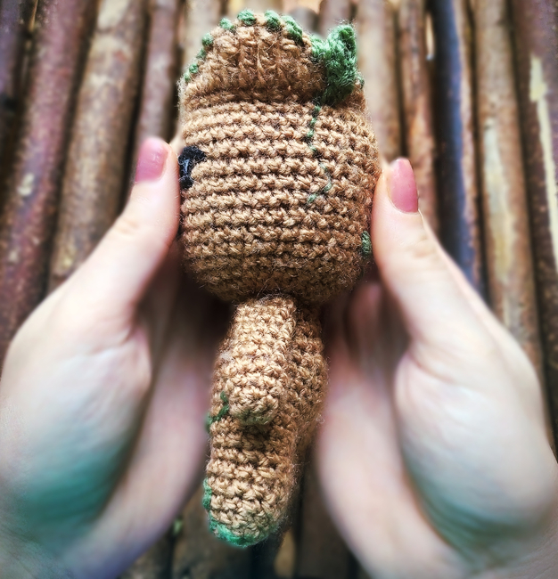 Materials needed: Crochet hook, stuffing, safety eyes, black, orange, gray, brown, green, and white yarn.