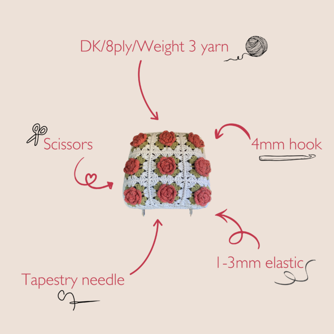 To make Rosy Drive Head Rest Cover you will need: 8ply cotton, 8ply cotton/acrylic, 8ply cotton, 1/2 a metre of 1-3mm elastic. Tools required: Size 4mm hook, Tapestry needle, Scissors.