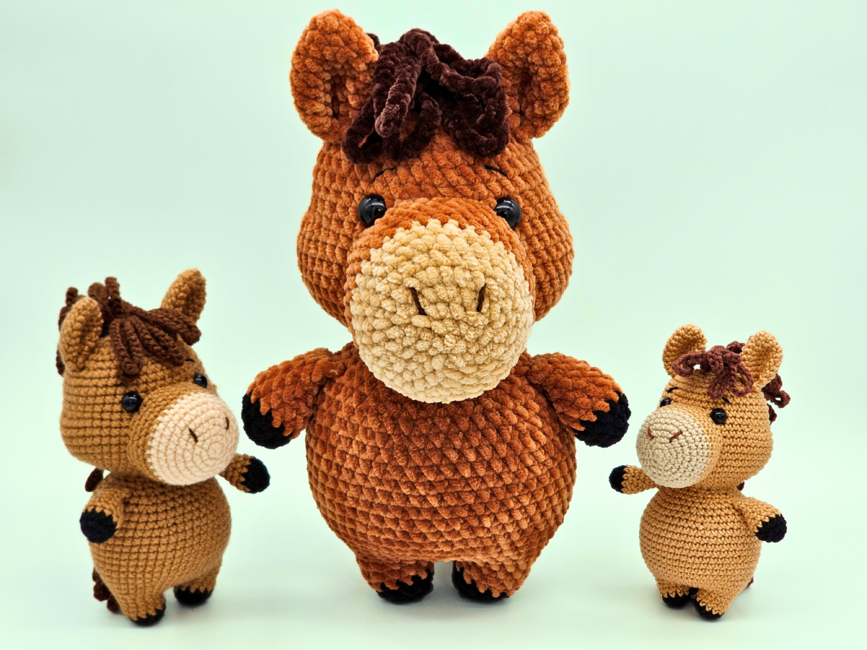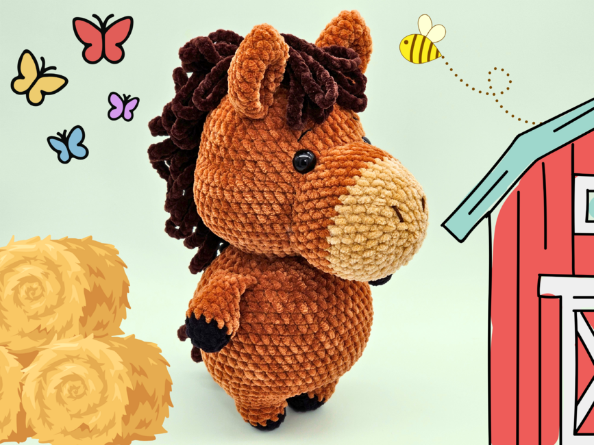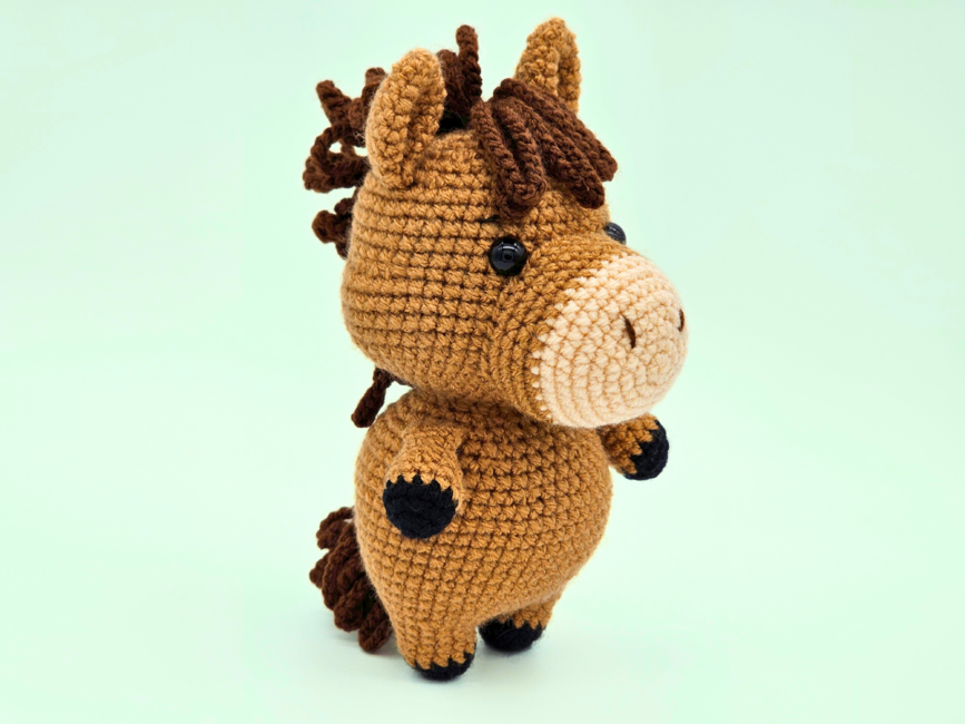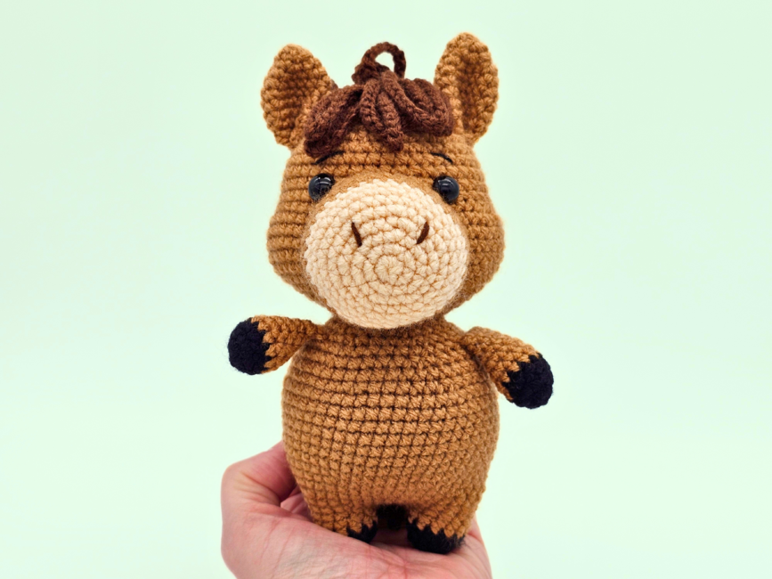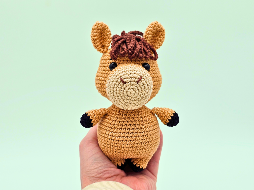 Introducing Rusty the Horse - an interactive crochet pattern for a low sew Amigurumi Farm Animal. The finished toy makes a perfect gift for animal lovers. I have provided detailed instructions and photos, making the pattern easy to follow for beginner to intermediate crocheters. You can use most yarn types - lightweight cotton creates a smaller decoration, while chunky plush yarn results in a larger, cuddly horse.