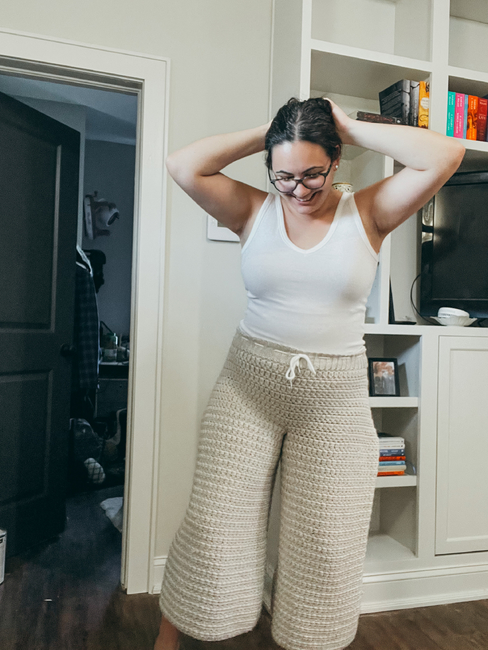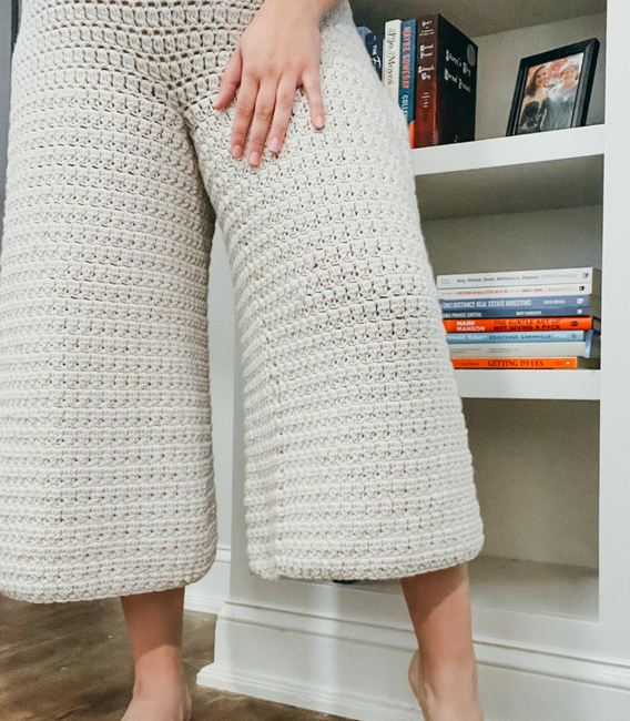 The Salara Pants are wide-leg crochet pants worked from the top down. They include hip shaping and made-to-measure elements to ensure proper fit around the thighs and legs.