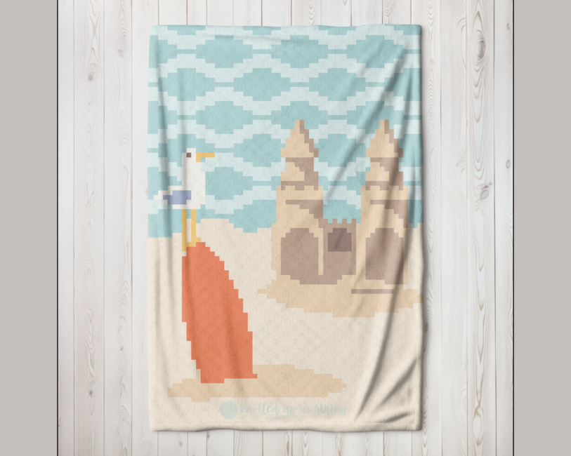 Why should this pattern be your next crochet adventure? Well, let me sea! Firstly, the "A Day at the Beach" blanket is perfect for bringing a touch of the seaside into your home, no matter how far from the ocean you might be. The delightful scene of a seagull on a surfboard, complemented by a sandcastle and ocean waves, evokes memories of carefree beach days and the soothing sound of waves crashing on the shore.