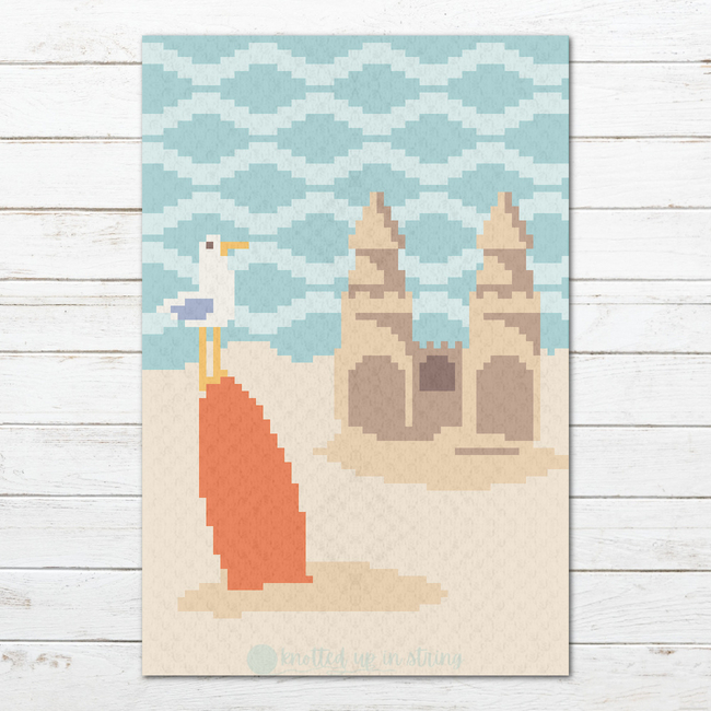 We'll start with a seagull standing proudly on a surfboard that's wedged upright in the golden sand. In the background, an impressive sandcastle stands tall, while gentle beach waves roll in. This pattern is not just a project; it's a celebration of all things summer, beach vibes, and nautical charm.