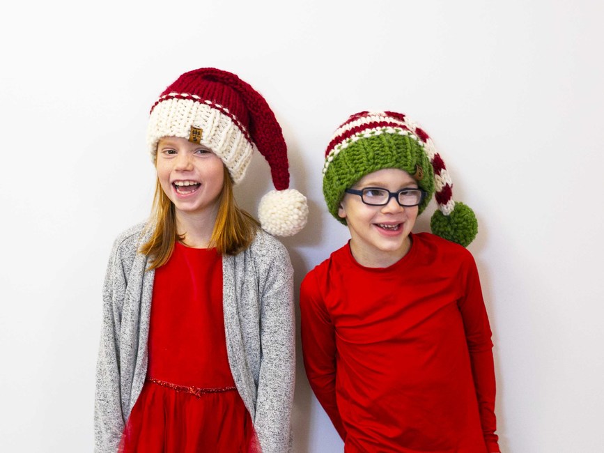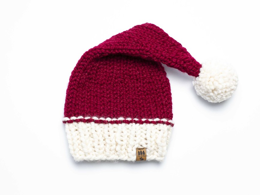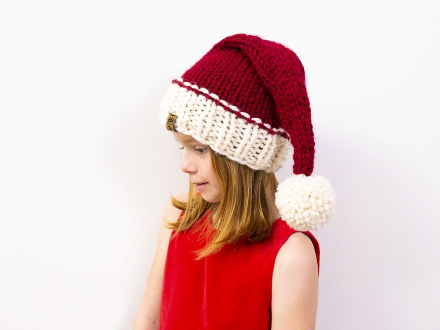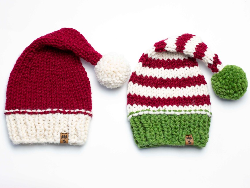 Our chunky Christmas elf stocking cap hat knitting pattern makes the perfect family Christmas photography prop or winter hat for your little one. This pattern is a twist on our original Santa cap. Changes are - slower, more gradual decrease as you work the top of the hat; slightly different style when transitioning from the brim to the main section of the hat; more sizes included.