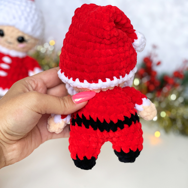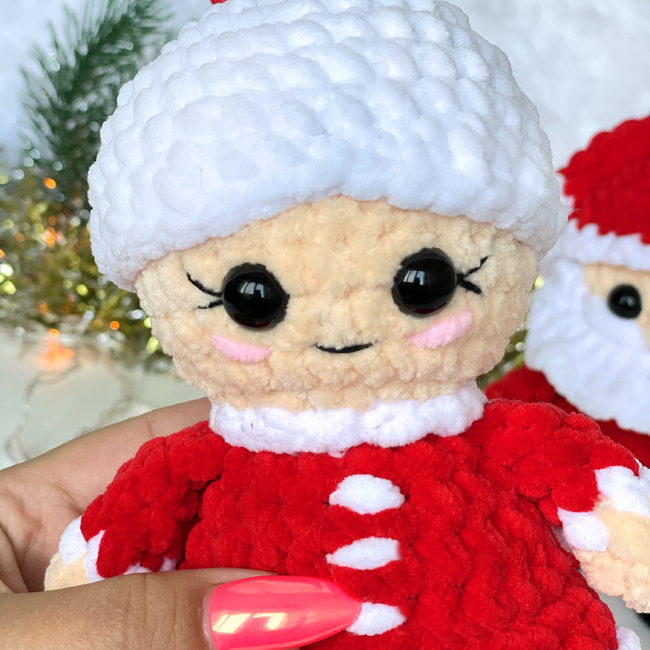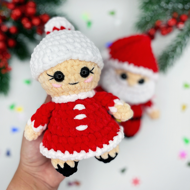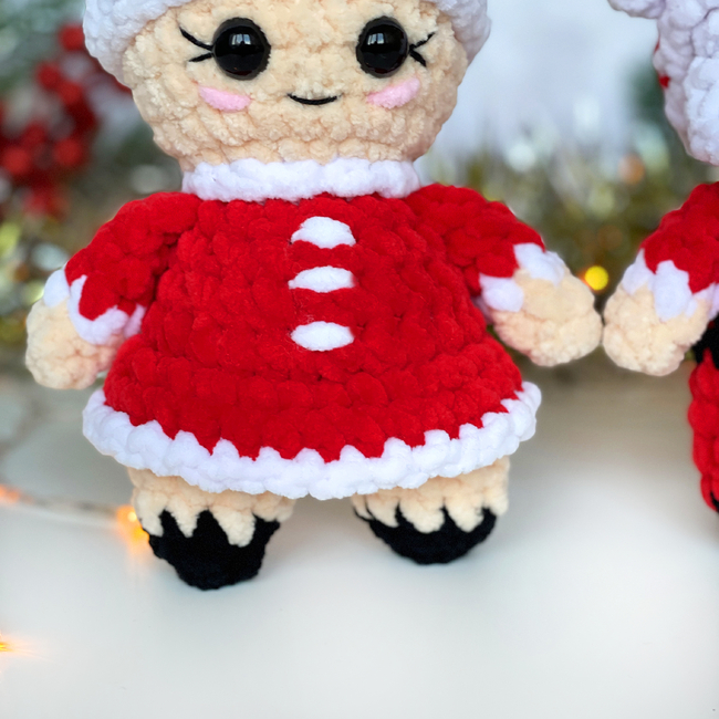 Both plush dolls are low-sew amigurumi, designed for quick, beginner-friendly crocheting perfect for holiday markets, handmade gifts, or Christmas decor. The bodies are crocheted in one piece, requiring minimal sewing!