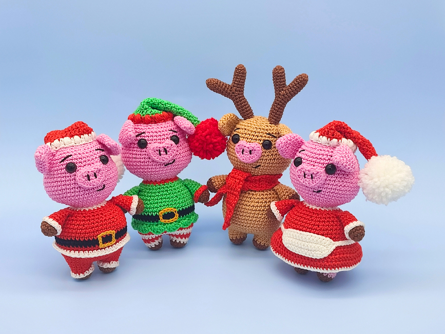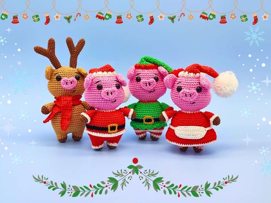 Introducing Santa's Delivery Crew Christmas Pig Bundle - interactive crochet patterns for four low sew Amigurumi Christmas Pigs.