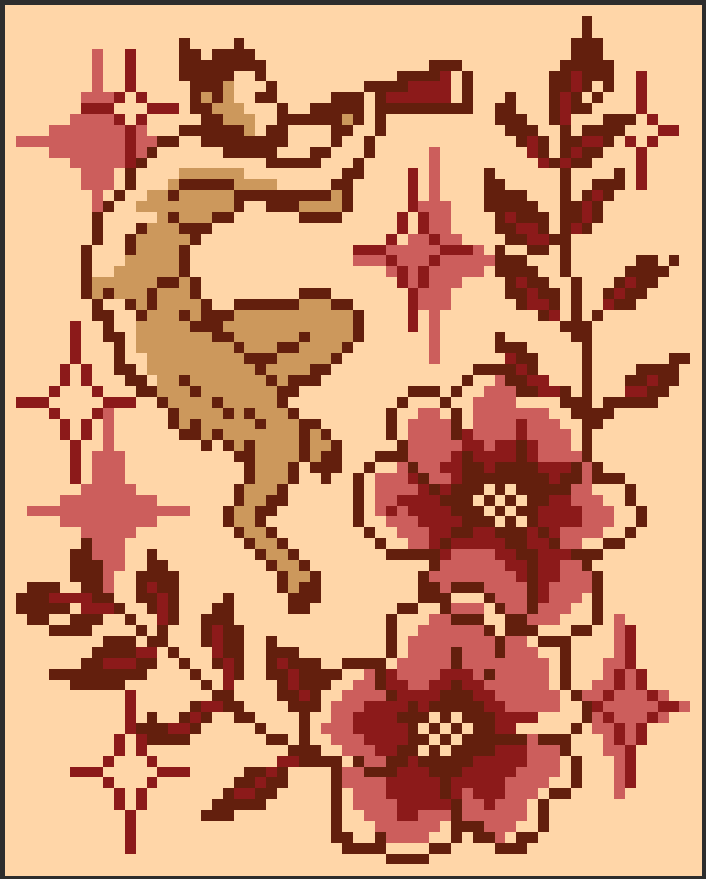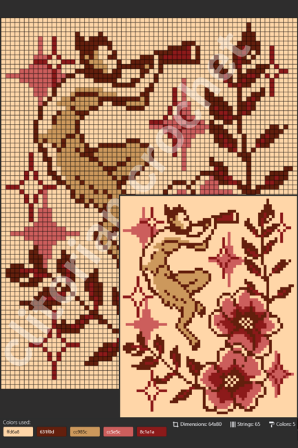 Included in this pattern is 3 .png files- the tapestry chart, the color key and dimensions, and the chart without grid lines as reference. This pattern can be created with any preferred method of tapestry crochet you prefer!