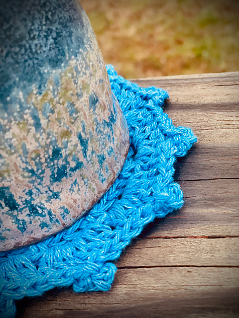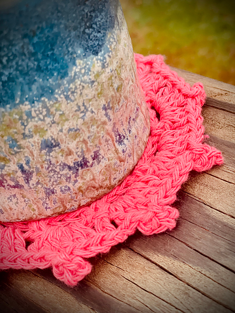 This pattern is made in worsted weight yarn with a 4.5mm hook. I think a synthetic or plant fiber is best for a coaster, as you will want it to be easy care. This coaster is worked in the round in dc st. You work increases every round to get it to the proper size and the last round adds a festive edging that is fun to make. Gauge is not crucial in such a small piece.