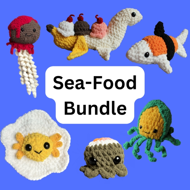 This bundle includes 6 food-themed underwater critters! This includes my Ba-Nessie Split, Sharkshimi, Meatball Jellyfish, Corn Squid, Egg-Xolotl and Sushi Octopus!
