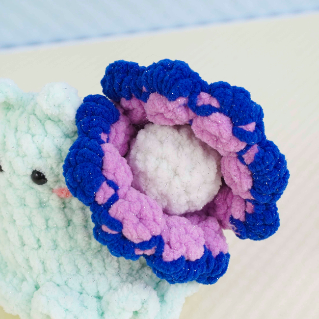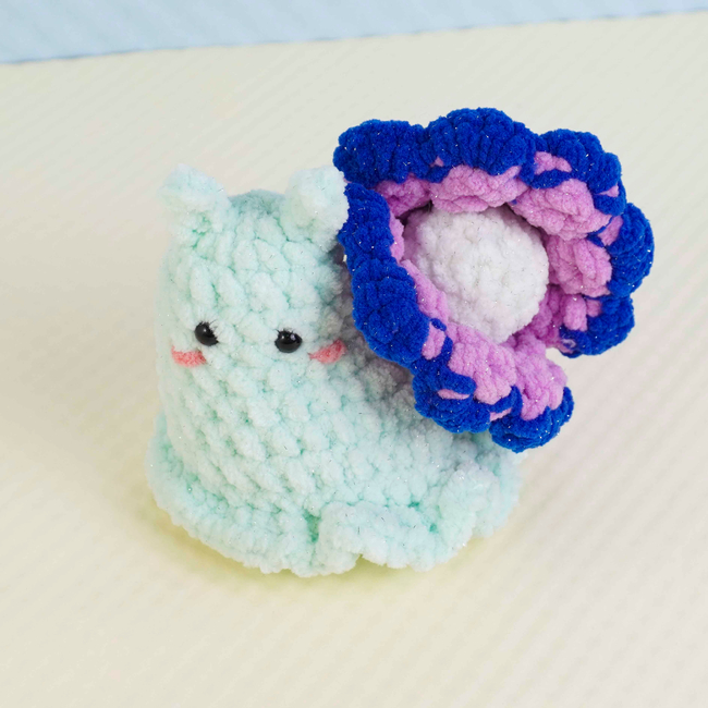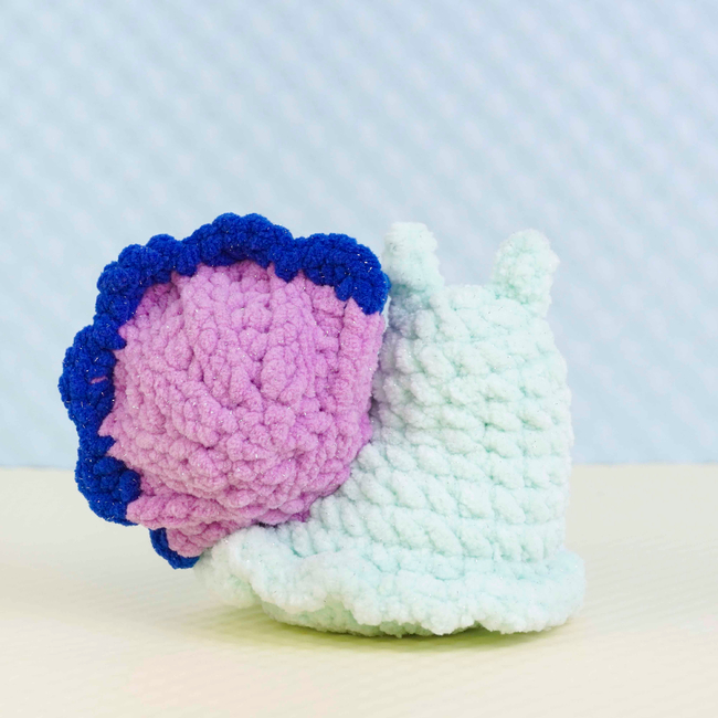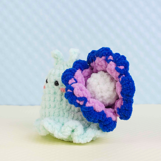 To make Seashell Snail Crochet Pattern you will need: Color: Purple, mint, dark blue, white, and a small amount of pink, Stitch markerSewing needleScissorsPlastic safety eyes (6mm x2)Fiberfill. Tools required: 4.0mm.