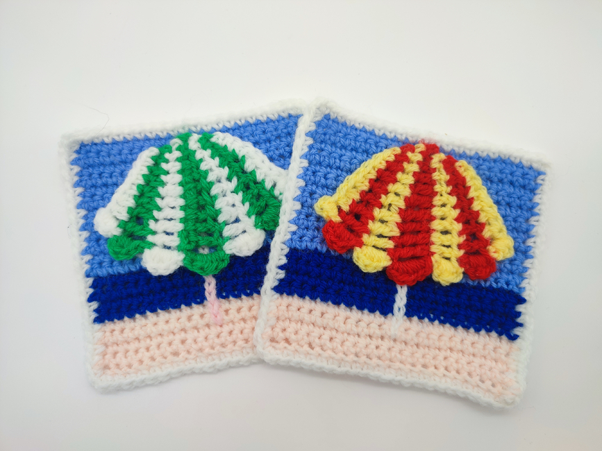 Each square is the same size, measuring approximately 12x12 cm after blocking when made with DK yarn and a 4 mm hook. With the border included, each square has 21 stitches on each side plus 1 stitch in each corner, making them perfect for combining into larger projects. When you join four of these squares together, they match the size of the larger beach-themed squares available in my pattern shop, allowing for seamless integration in your projects. These squares are ideal for a range of designs, including blankets, tote bags, and decorative items. This pattern provides detailed instructions on how to crochet the squares, join them together, and create a stylish cushion cover that fits a 25 cm x 25 cm cushion pad. You can also purchase all of these squares, along with my larger beach-themed squares, as a bundle for my beach-themed blanket.