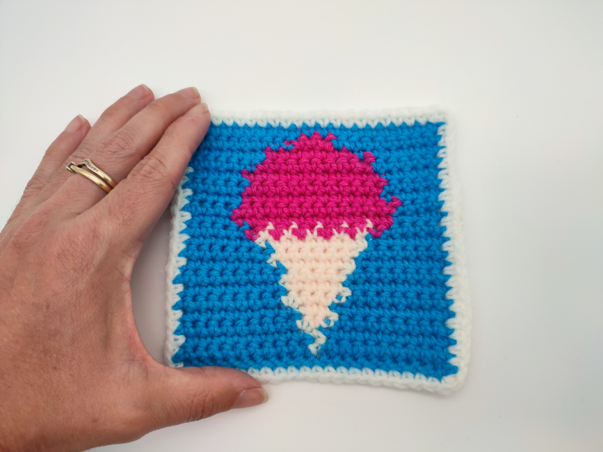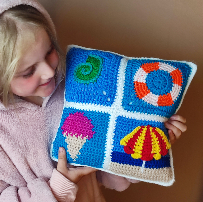 This pattern is for a small cushion cover featuring four beach-themed squares: a seashell, an ice cream, a sun umbrella, and a lifebuoy. Each square pattern includes a variety of colourway options to inspire your creativity, allowing you to personalise your cushion to match your style. If you have a particular favourite design, you can choose to make four of the same square rather than mixing designs. The squares incorporate a mix of crochet techniques, including intarsia crochet, working in the round, surface slip stitch, and appliqué. All techniques are fully explained within the pattern, providing a wonderful opportunity to explore and refine your skills.