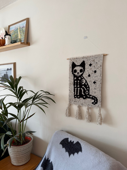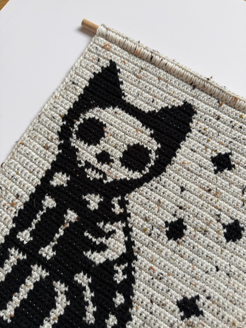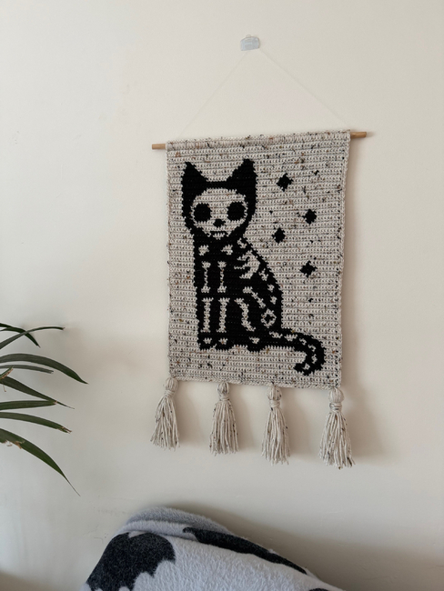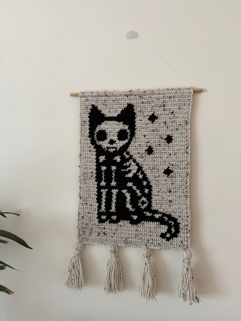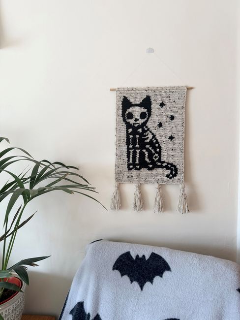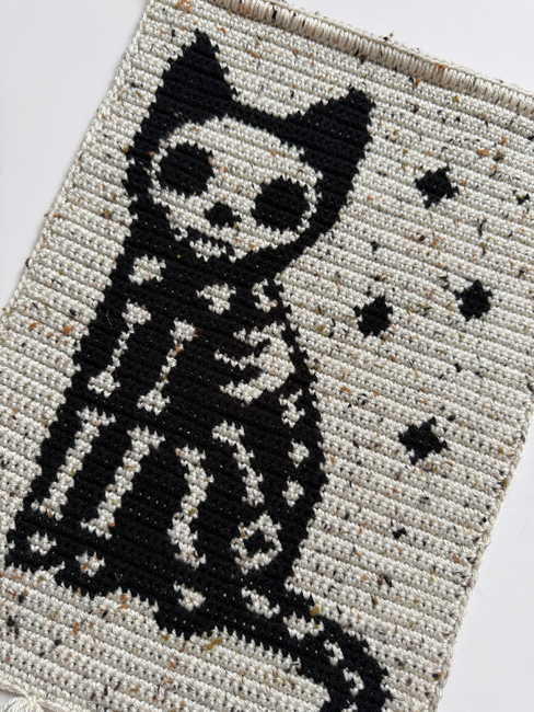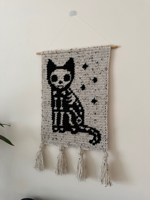Crochet pattern for a Halloween inspired skeleton cat wall hanging.