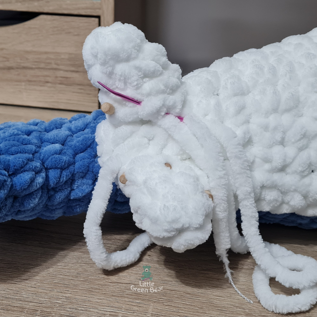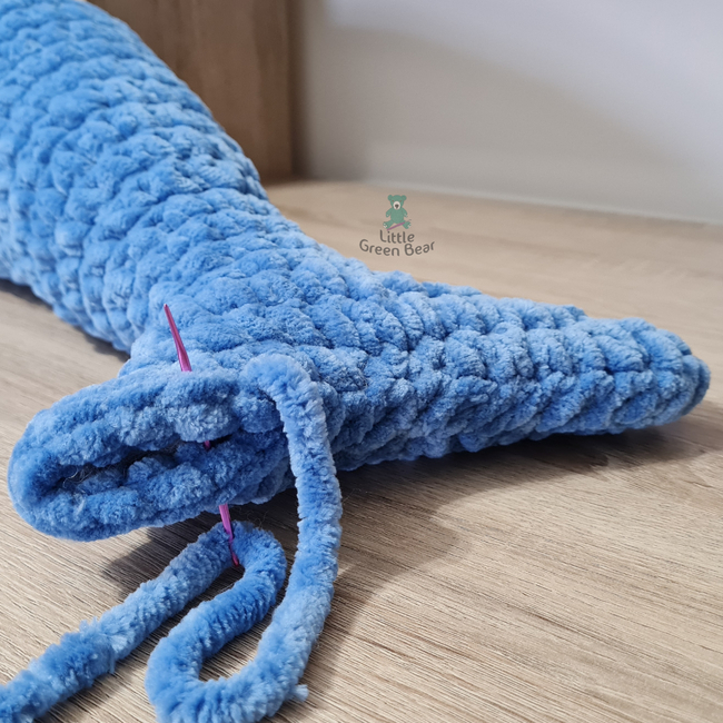 You‘ll need 400g of Jumbo #7 weight yarn, I‘ve used Hobbii Honey Bunny Big - Cool Blue (78) 2 x 300g skeins You‘ll need 100g of Jumbo #7 weight yarn, I‘ve used Hobbii Honey Bunny Big - White (01) 1 x 300g skein A small amount of black yarn for the smile and gills (I used a super chunky weight yarn for this) A small amount of white Aran yarn for sewing the underside piece