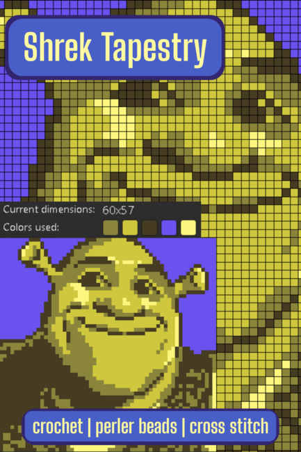 This tapestry graph is a portrait of everyone's favorite ogre, Shrek! Your purchase gets you the pattern chart, the dimensions and color key, and the pattern without the grid. This is a chart only, no written instructions beyond a simple explanation of how you can create them. If you want, you can also purchase my tapestry charts on my ko-fi shop: