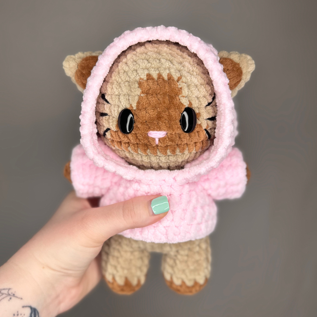 Head, body, legs, arms, ears, and tail color (less than 1/2 of a skein of parfait chunky by Premier Yarns in color toffee) Head patch, feet, hands, and ear detail color (less than 1/4 of a skein of parfait chunky by Premier Yarns in color teddy bear) Hoodie color (1/4 of a skein of parfait chunky by Premier Yarns in color cotton candy) Face detail color (small amount of any pink worsted weight yarn) Face detail color (small amount of any black worsted weight yarn)