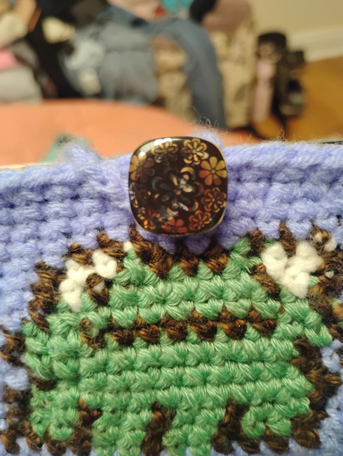 To make Simple cottagecore Booksleve for school you will need: Purplw Background yarn, Green Frog yarn, White Mushroom stalk yarn, Brown Mushroom yarn, Button.