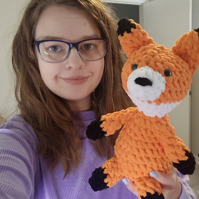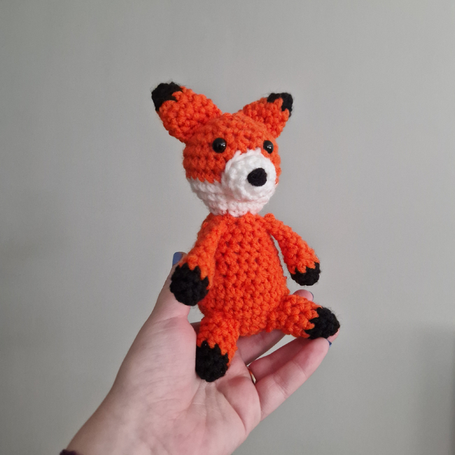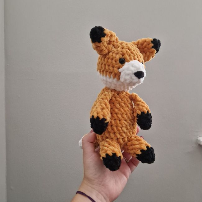 This sitting fox pattern takes approximately an hour and the body, arms and head are all crocheted together. Everything else is sewn on once the main section is completed