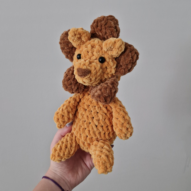 This sitting lion pattern takes approximately an hour to two hours. The body, arms and head are all crocheted together. Everything else is sewn on once the main section is completed