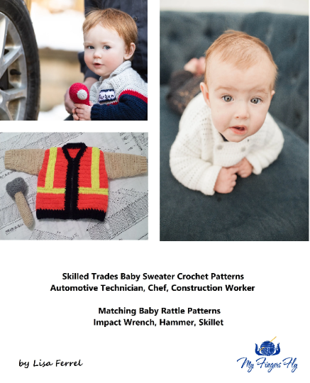 These sweaters make great shower gifts, photography props or baby's first Halloween costume. Each sweater pattern has a corresponding baby rattle pattern: a skillet for the chef, an impact wrench for the auto mechanic, and a hammer for the construction worker. All 3 sweater designs including sizing for Newborn, 3-6 months, and 9-12 months. Auto Mechanic sweater also includes sizing for 18 months.