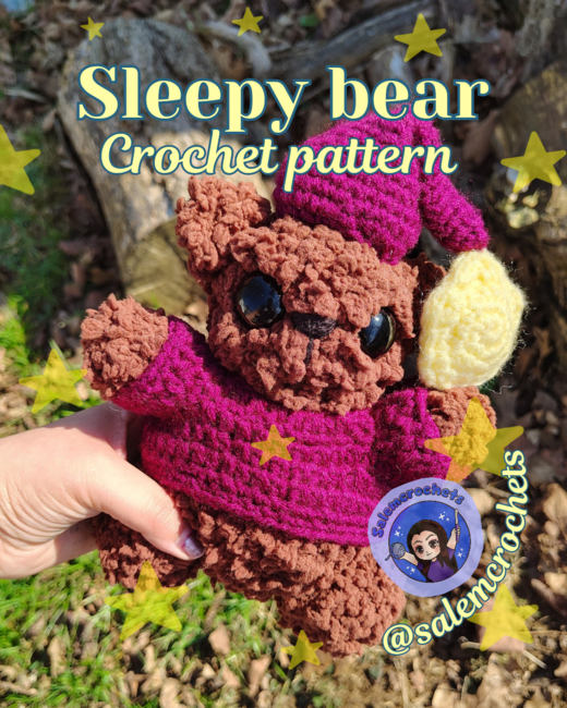 Salem crochets designed the Sleepy bear pattern. Find more of their patterns on their Ribblr shop page.