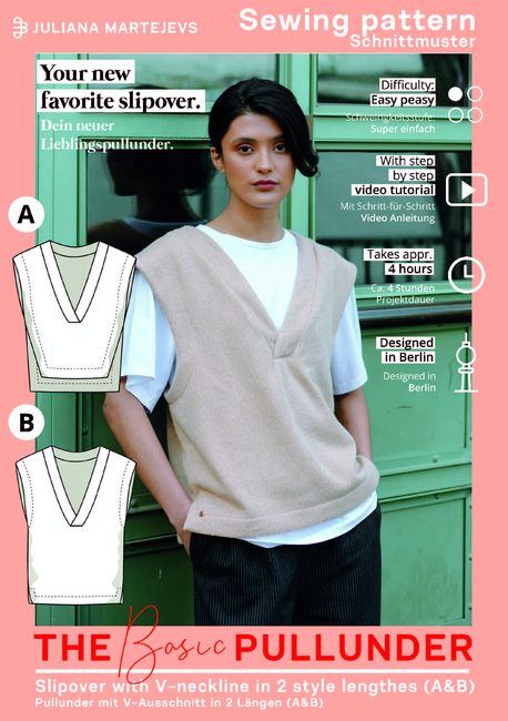 When cutting out your slipover pattern, you can choose between two different lengths: waist short or hip long. Check out the pictures in the gallery for reference: the gray sweater is the short version and the camel one is the long version. Everything you need to know to sew the sweater yourself is described in the included written instructions and the Basic Slipover video tutorial.