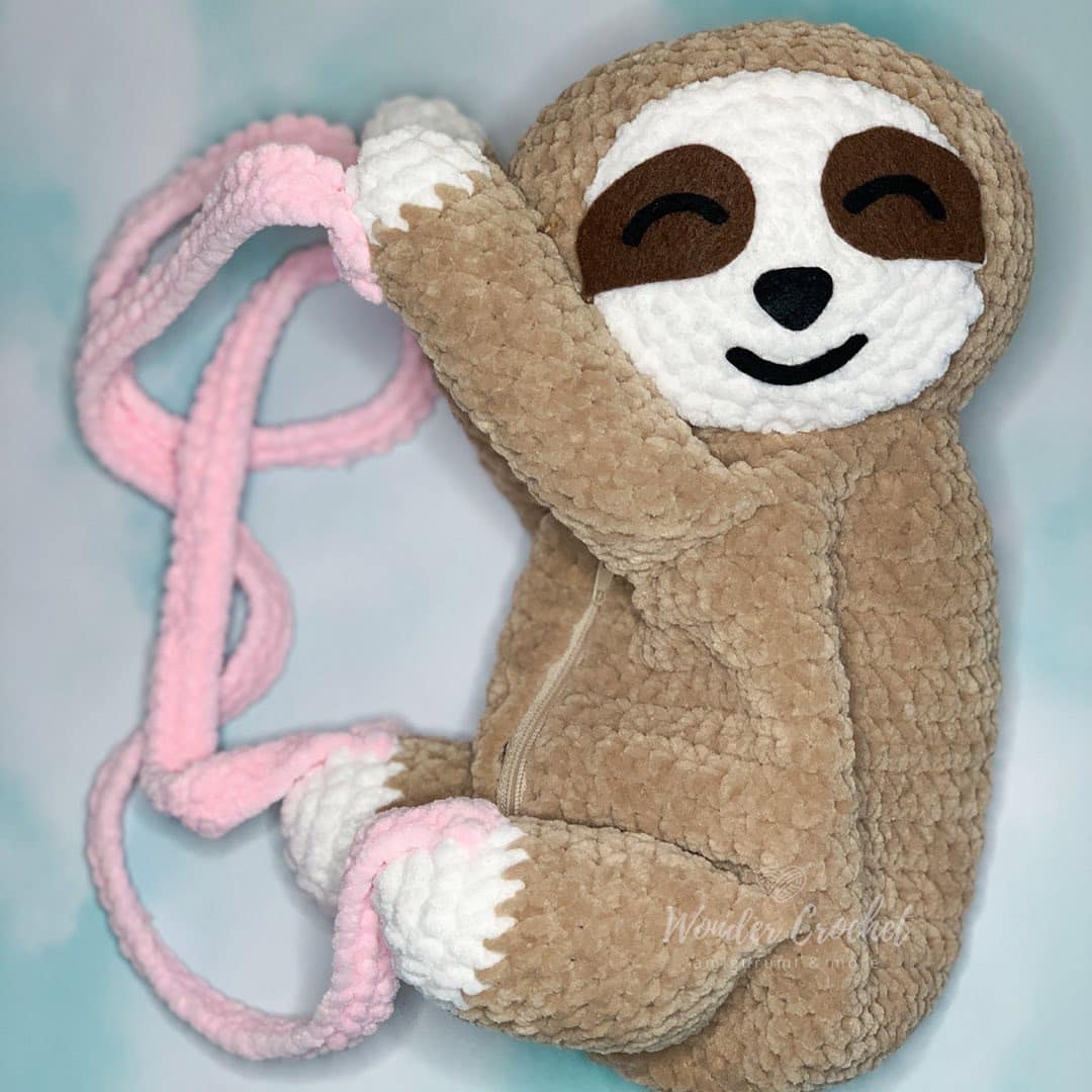 Make your own fluffy sloth backpack with this crochet pattern. This backpack is functional with a zipper and straps.