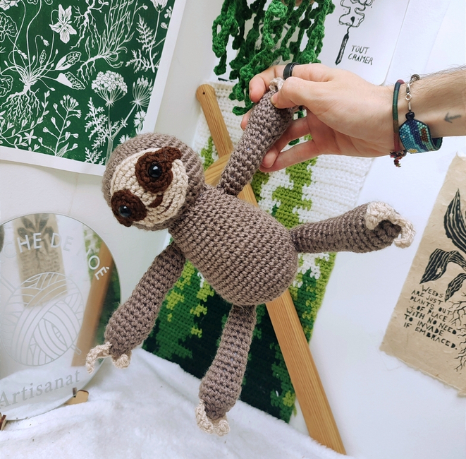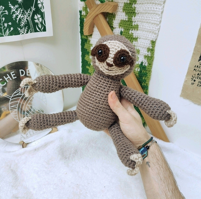 With regular yarn, this will give you a 20-30cm sloth with long and mobile arms abd legs, perfect to cuddle and / or hand everywere !