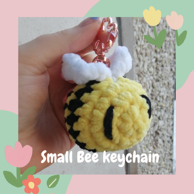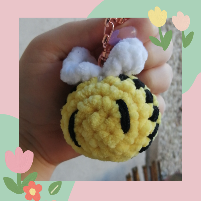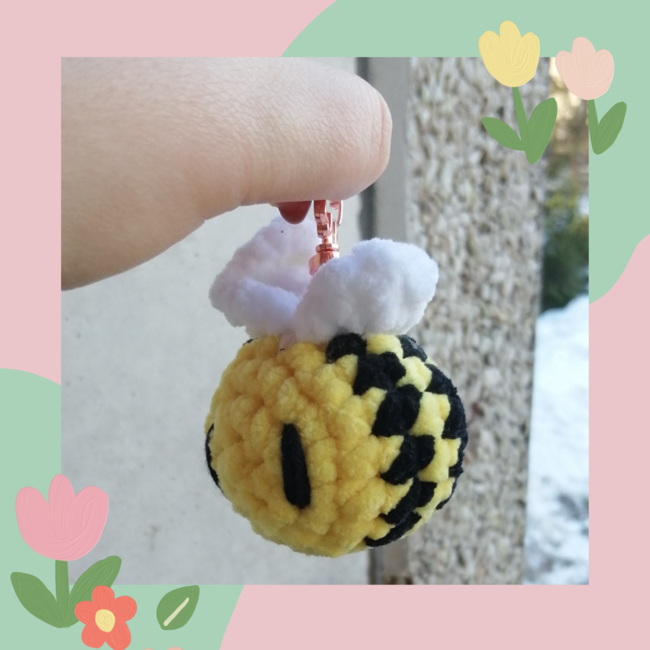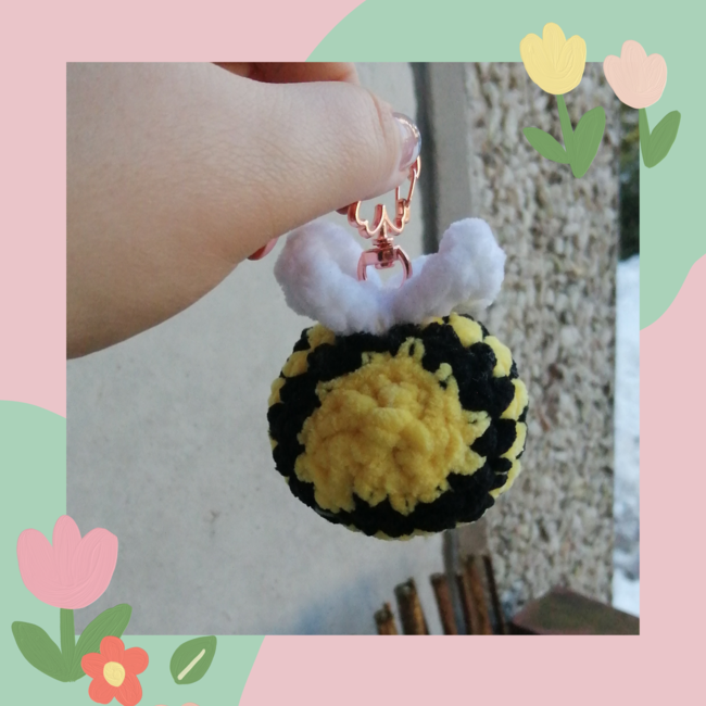 Cotton yarn (optional, sewing the wings and the key chain on) Plush yarn in yellow Plush yarn in black Plush yarn in white Cotton yarn (optional, for embroidering the eyes)