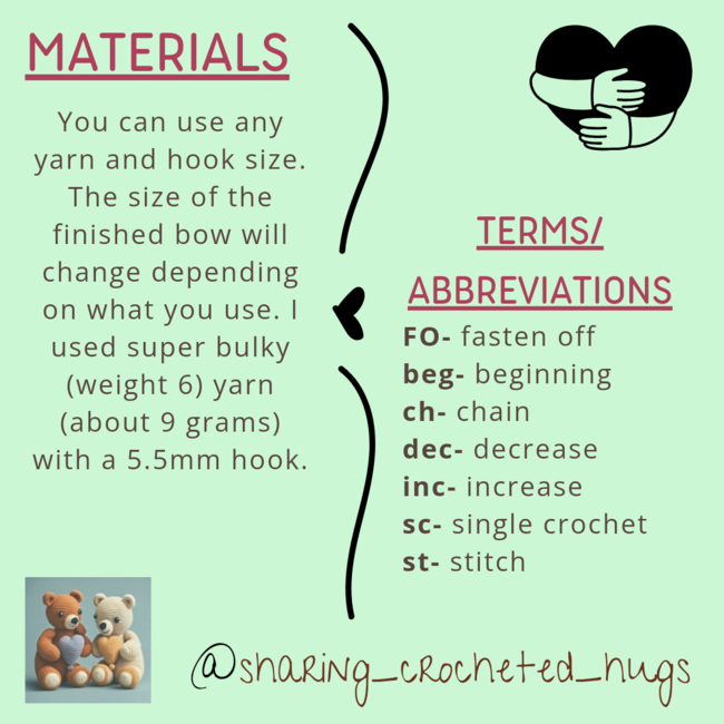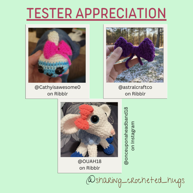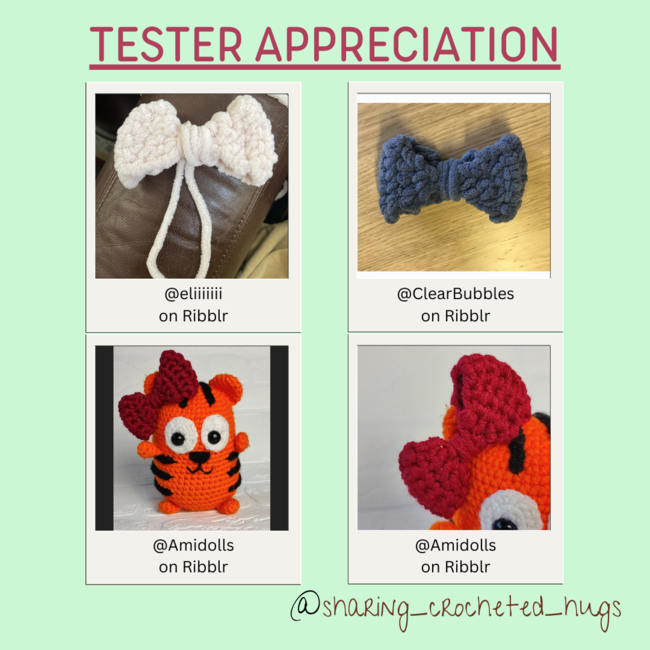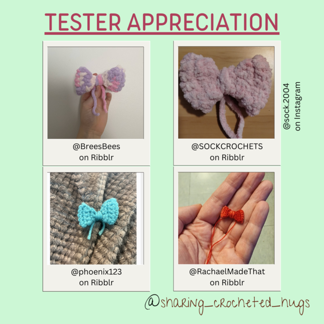 This cute bow is my first pattern I ever wrote from just having an idea and experimenting with it (I did not look at other patterns of bows first, just did trials and error). With weight 6 yarn it is small (about 3.25") and could be put on amigurumi. I had so many ideas on how to make different bows so this is version 1 of 6. I decided my first couple will be free for followers. This bow is NOT symmetrical but still turns out cute, especially when don't in a chunkier yarn. It not being symmetrical makes the top more flat and the bottom curved in more. I hope you enjoy!