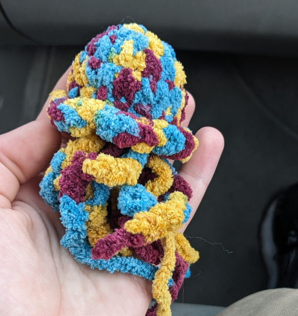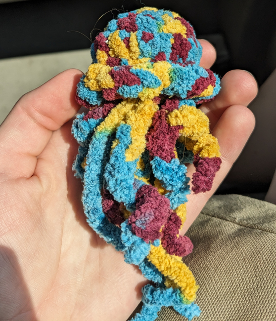 The tricolored jellyfish is made with Bulky (5) yarn and a 6 mm hook. The two toned jellyfish is made with DK (3) yarn and a 2.5 mm hook.