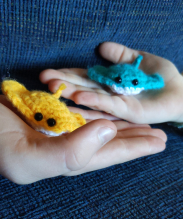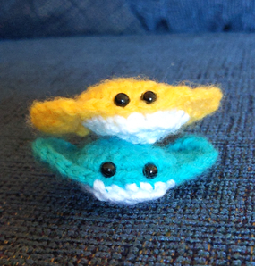 1 color of yarn for the main body of the stingray. (I used DK but you can use anything.) White/lighter colored yarn for the bottom.