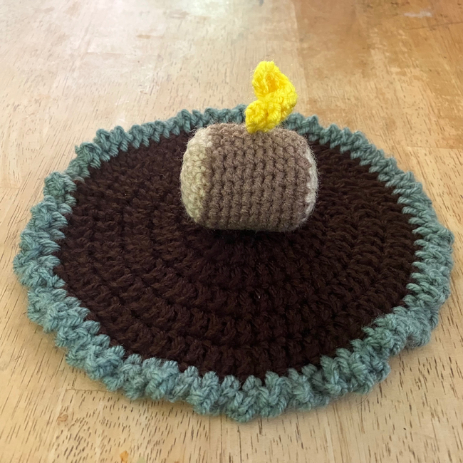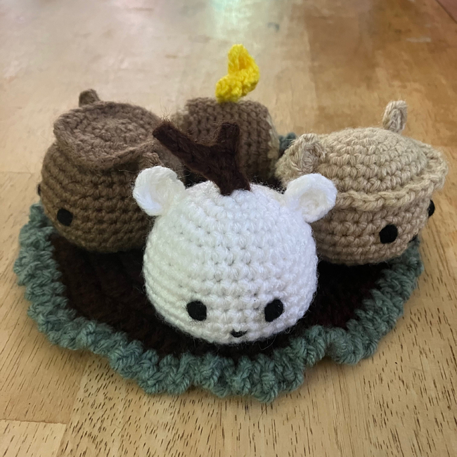 This pattern consists of three characters based on a chocolate bar, marshmallow, and graham cracker with a campfire and appliqué that can be used as a playset.