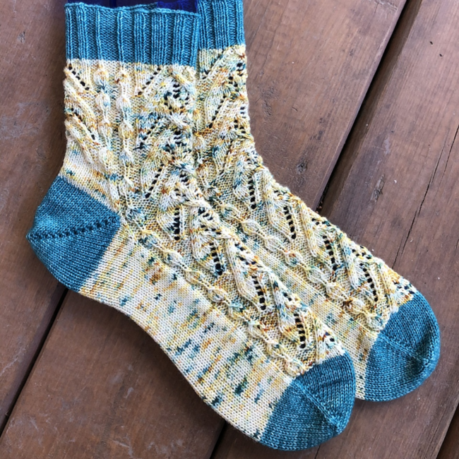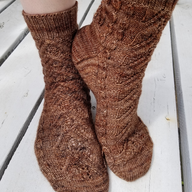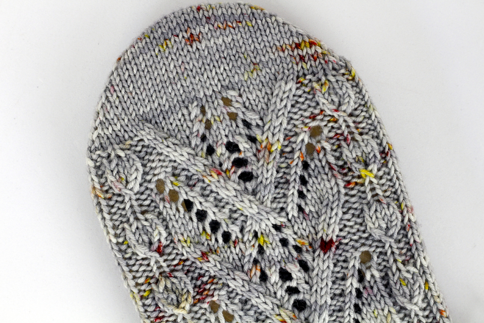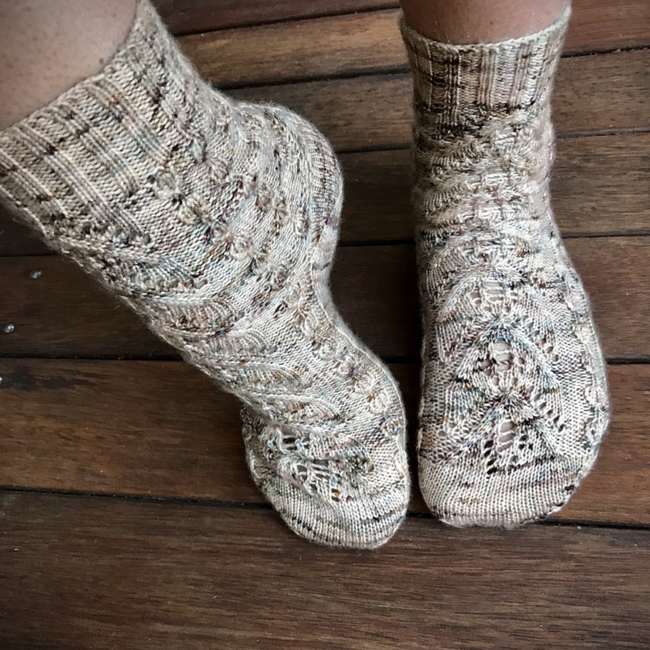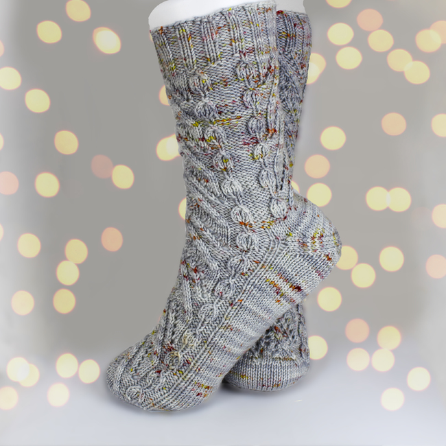 Worked in the round, Smores on the Campfire contains both cuff-down and toe-up written directions and a chart for the pattern stitch. The pattern has instructions for an afterthought heel, but you may substitute whatever heel you enjoy using.