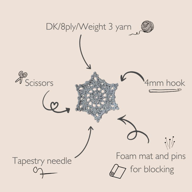 To make Snowflake Coasters you will need: Scrap yarn, Scissors. Tools required: 5mm, Tapestry needle.