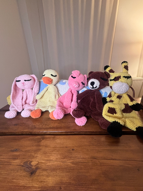 Make your own adorable collection of snuggly amigurumi animals with this Snuggler Bundle, featuring 5 digital crochet patterns: a teddy bear, pig, bunny, giraffe, and duck. Each design is perfect for confident beginners and combines the softness of a mini blanket with the charm of a stuffed plushie.