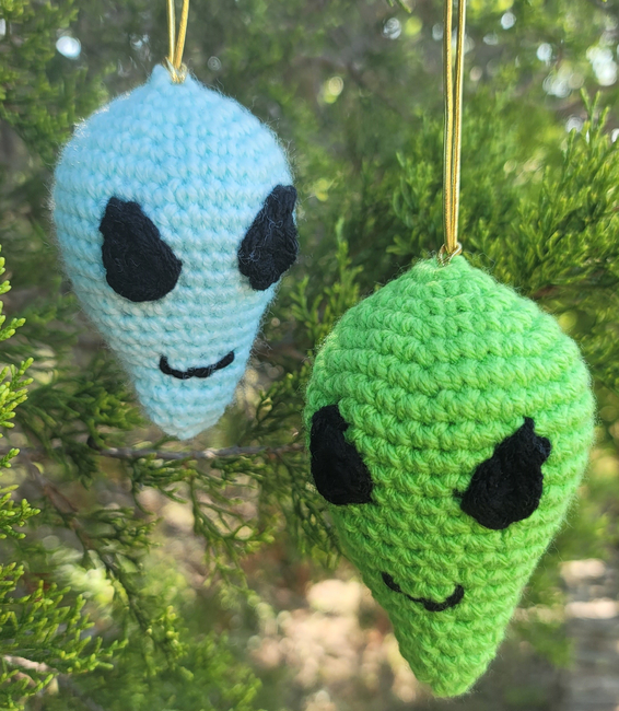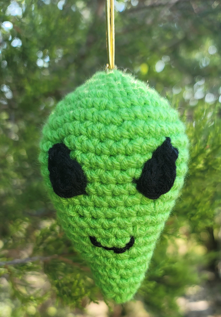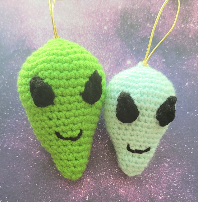 Crochet a special Christmas ornament for the UFO enthusiast in your family. This easy Space Alien Christmas Ornament Crochet Pattern can be made with worsted or DK weight yarn with a little bit of black yarn and a little bit of stuffing. Make several in one evening to delight your Trekkie family.