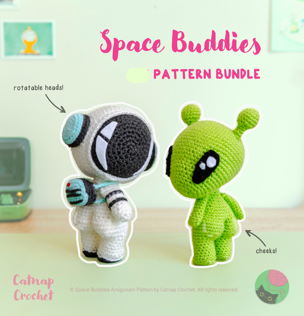 Catnap Crochet designed the Space Buddies with Booty Cheeks Bundle pattern. Find more of their patterns on their Ribblr shop page.