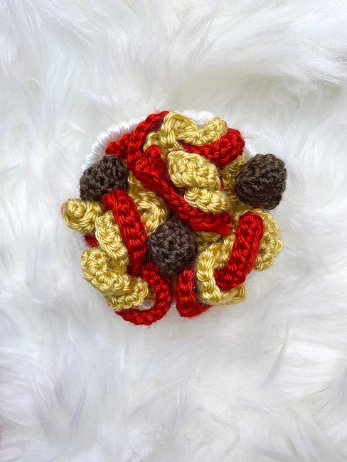 This spaghetti and meatball pattern uses no stuffing and works up quickly. You can build and rebuild your plate or opt to sew it together for more stability.
