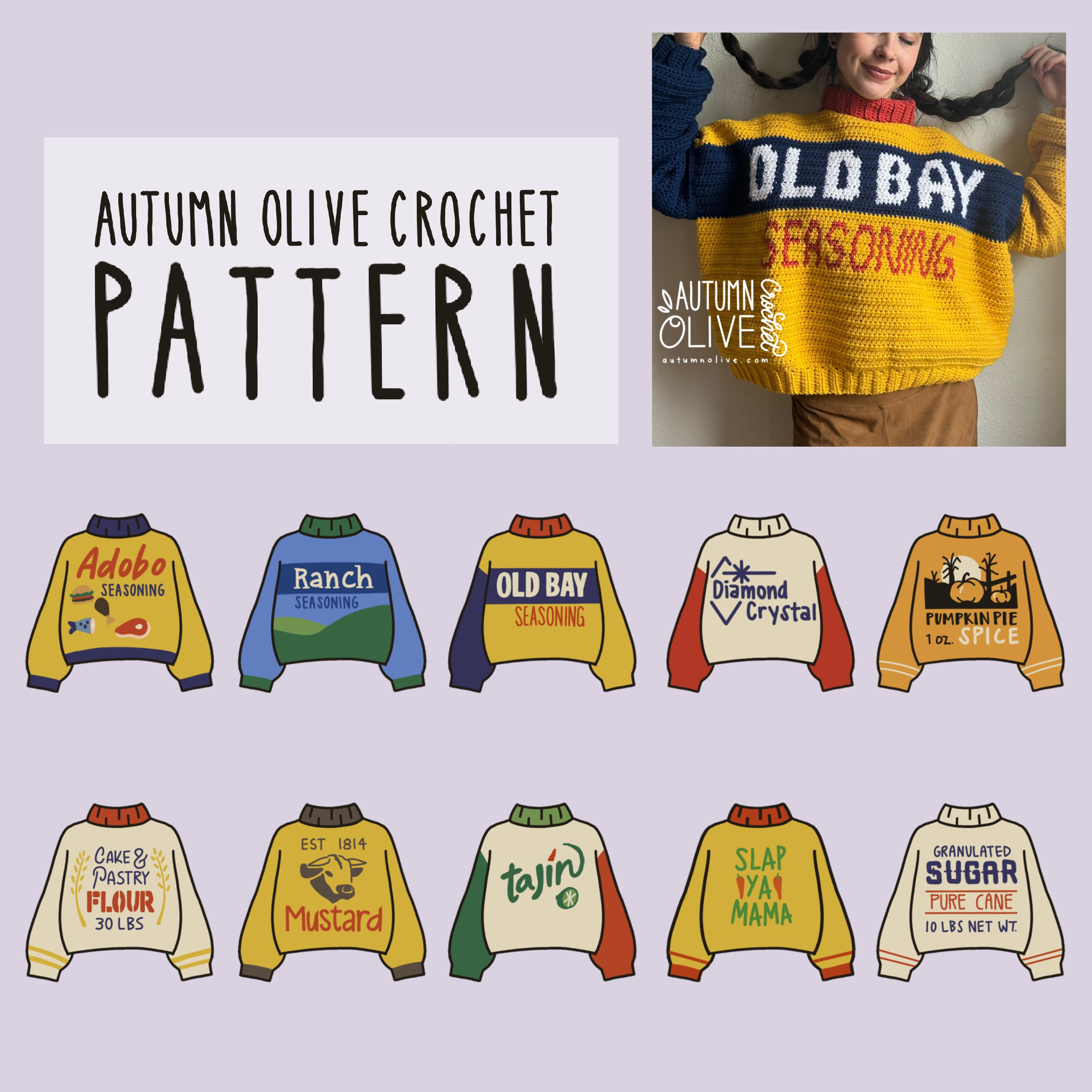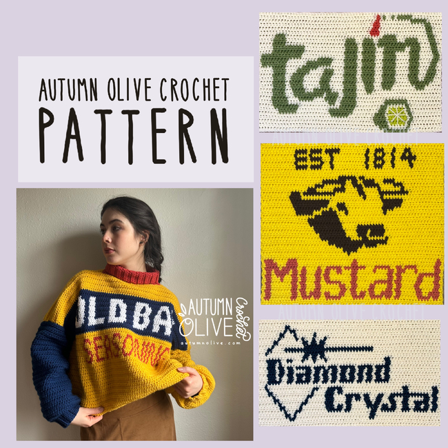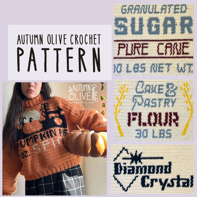 spice rack sweaters is an Intermediate Crochet pattern designed by Autumn Olive Crochet for making a Clothing. SPICE RACK SWEATERS PATTERN by autumn olivia ward colorwork graphs are designed for the included autumn olive oversized pullover pattern includes 10 total vintage spice & pantry label inspired colorwork designs with history tidbits includes stitc...