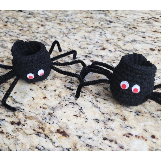 Add some creepy crawlies to your dining room for Halloween. Easy chair socks crochet pattern uses only 10 yards of black worsted weight yarn per sock, so it makes a great stash buster project. Glue on some googly eyes and insert pipe cleaners for the legs. This pattern is so quick and easy, you can make enough for your entire dining room in an evening.